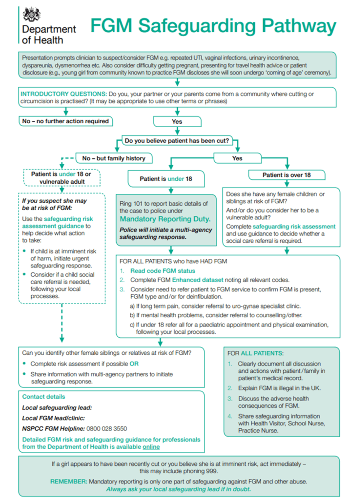 All professionals should be familiar with the risk indicators of FGM and be aware of what steps to take if they are concerned that a child/ young person has or is likely to be the victim of FGM. Remember reporting FGM is a mandatory legal duty.