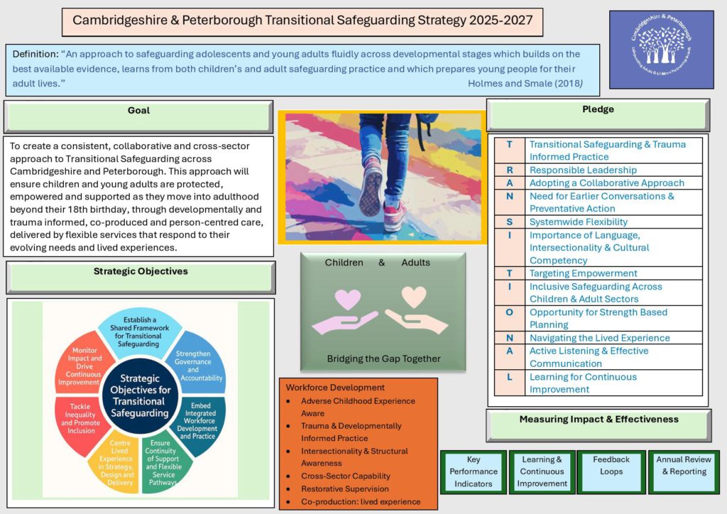 Transitional Safeguarding is a national priority that recognises the need for a more coherent, developmentally informed approach to safeguarding children as they move between services, approach adulthood and experience transition as young adults. This strategy sets out our shared commitment across Cambridgeshire and Peterborough to embed Transitional Safeguarding into core business, ensuring that safeguarding and support does not stop at 18 and that services are responsive to the realities of children and young adult’s lives.