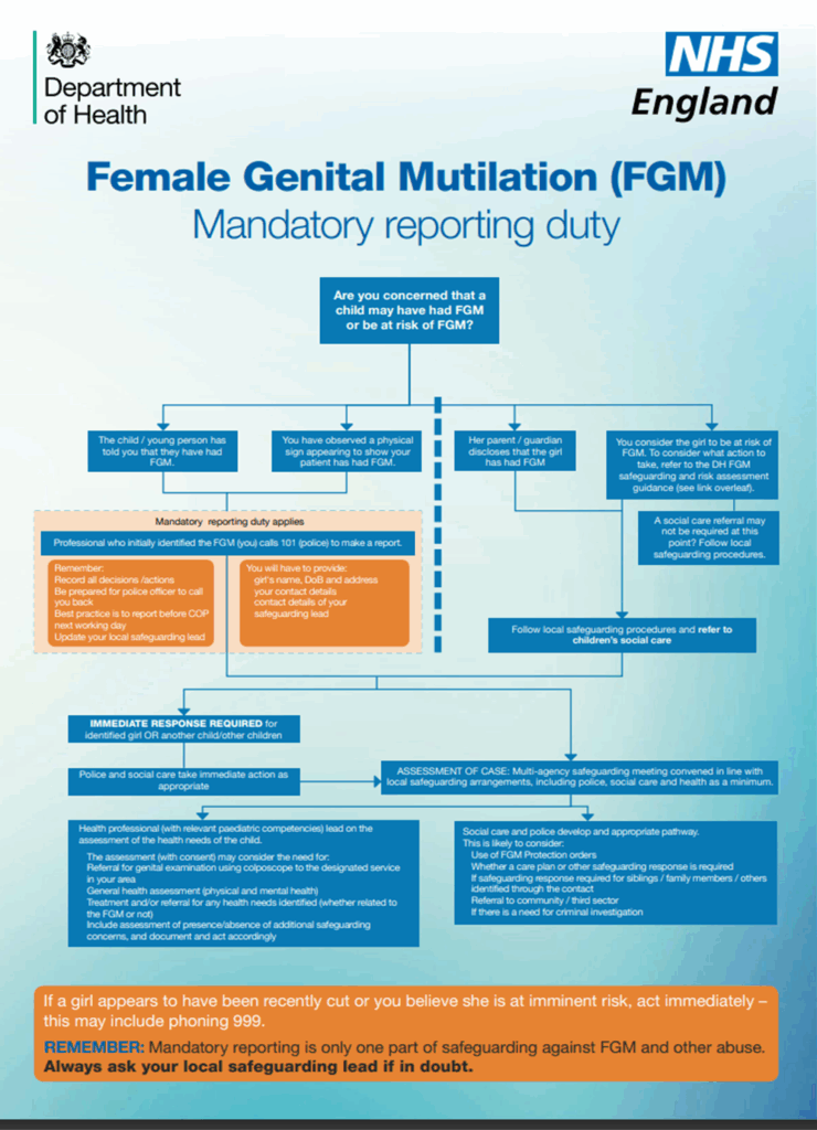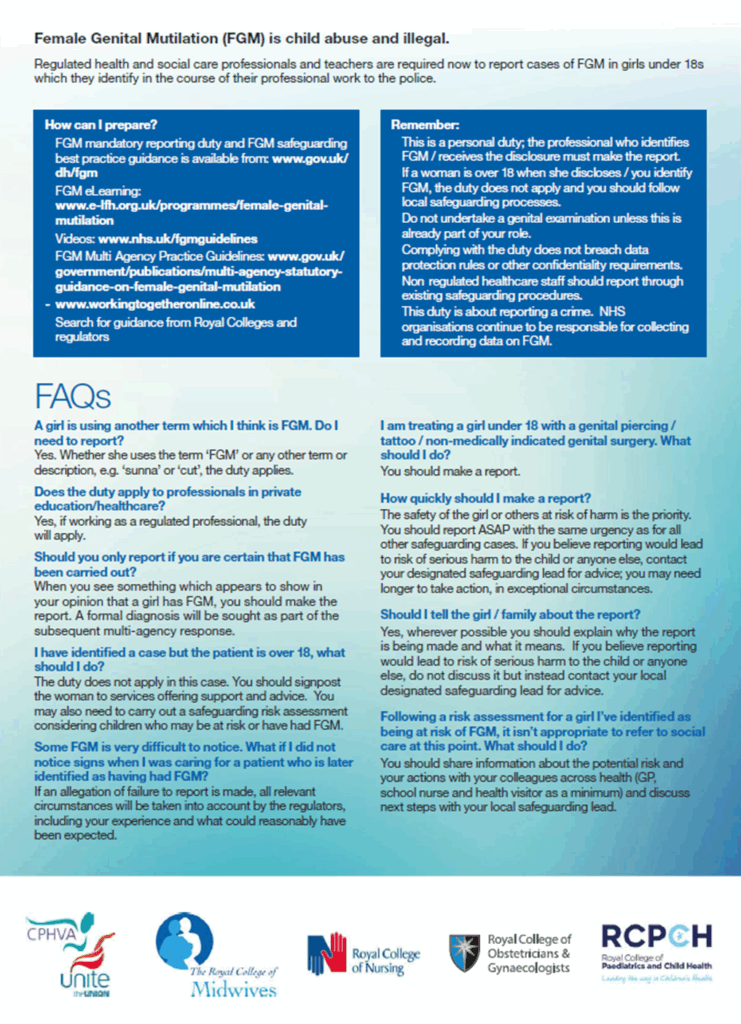 All professionals should be familiar with the risk indicators of FGM and be aware of what steps to take if they are concerned that a child/ young person has or is likely to be the victim of FGM. Remember reporting FGM is a mandatory legal duty.